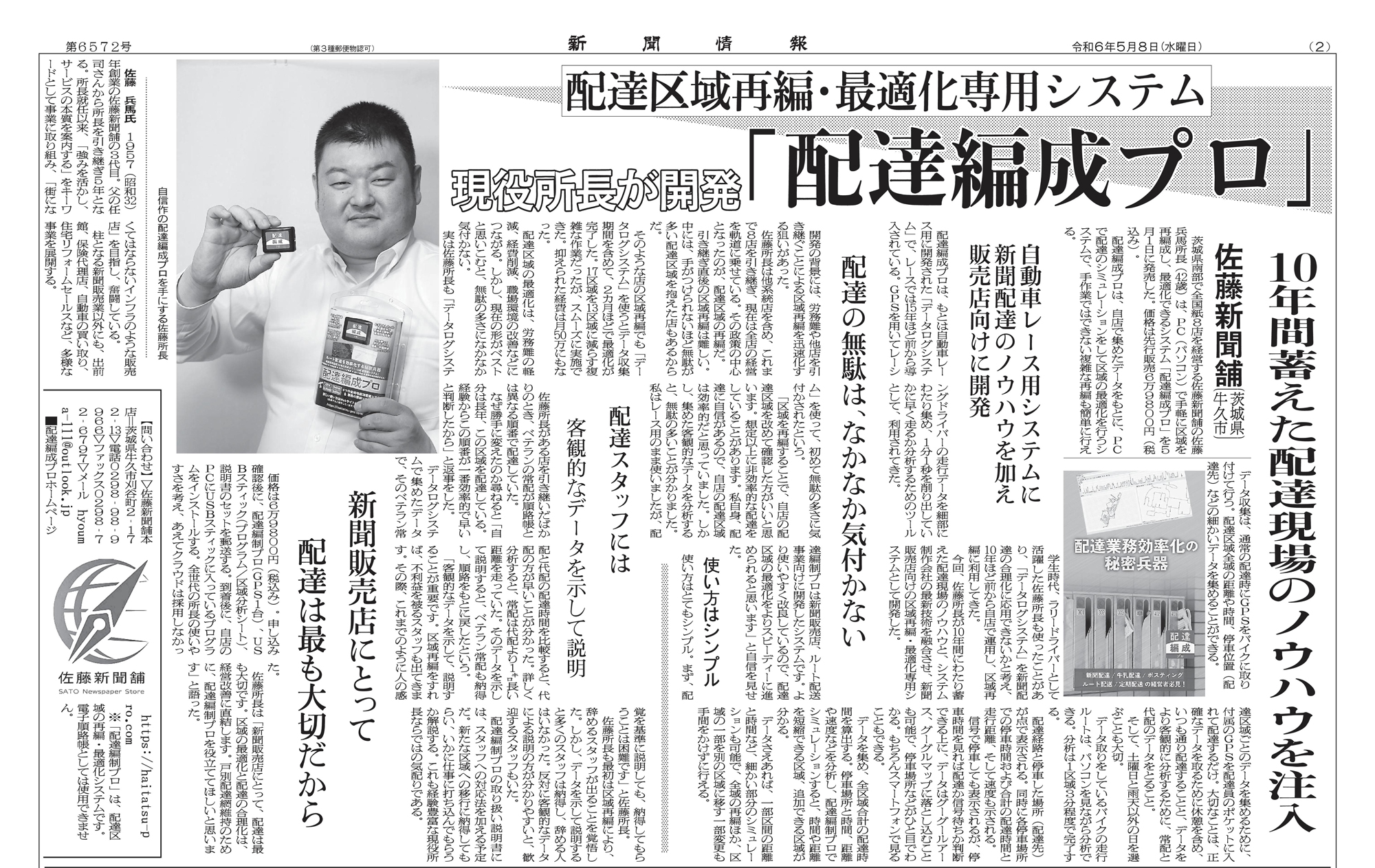 新聞を中心にマスコミ、広告業界などの動きを伝えている業界紙「新聞情報」(週2回発行)の2024年5月8日号に、「配達編成プロ」が掲載されました。